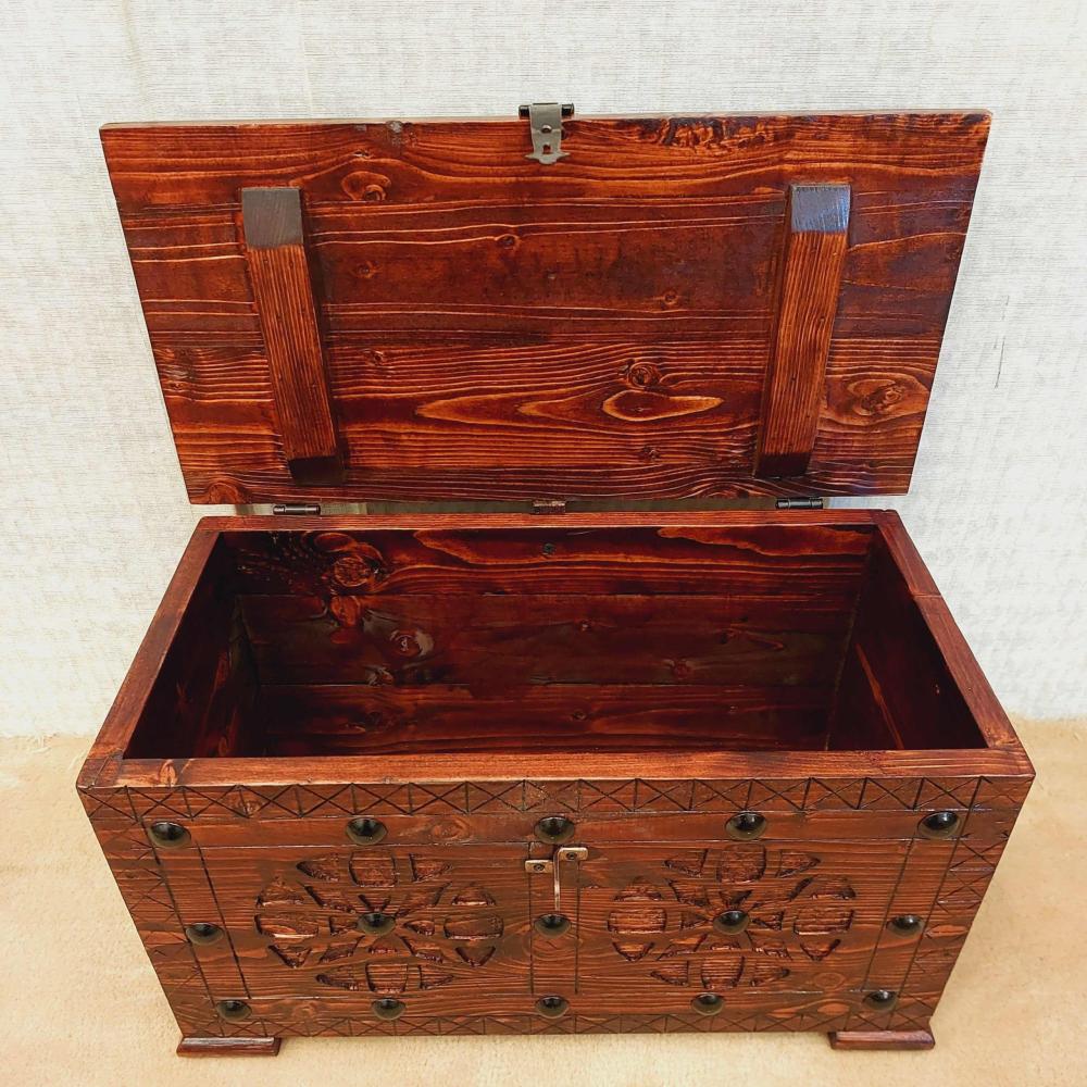 تم تزويد الصندوق بقطع معدنية زخرفية وأقفال متينة تضيف لمسة من الأصالة والفخامة. يمكن استخدامه كقطعة ديكور أنيقة في المنزل أو المكتب، أو كحل عملي وأنيق لتخزين المقتنيات الثمينة، المجوهرات، أو حتى الهدايا الخاصة.