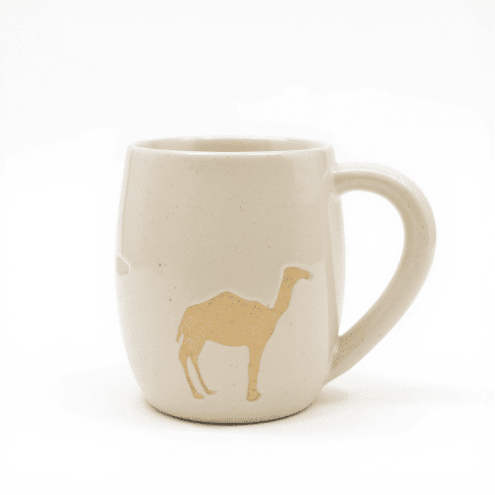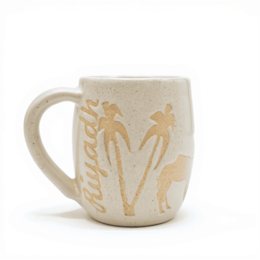 كوب خزفي أنيق يحمل طابع مدينة الرياض، محفور يدويًا بدقة عالية بنقوش مستوحاة من الصحراء، مثل النخيل والجمل، مع كلمة "Riyadh" بتصميم فني فريد. قطعة تذكارية تضيف لمسة من التراث والهوية في كل رشفة.